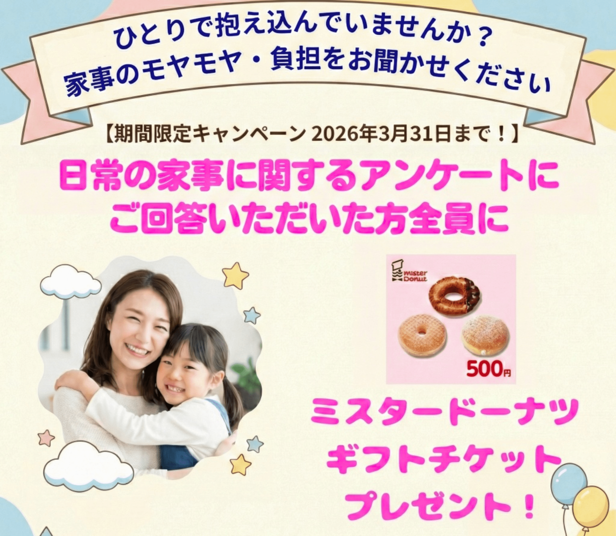 保護中: 【全員プレゼント】アンケート回答でミスドギフト券がもらえる!家事・育児応援キャンペーン実施中