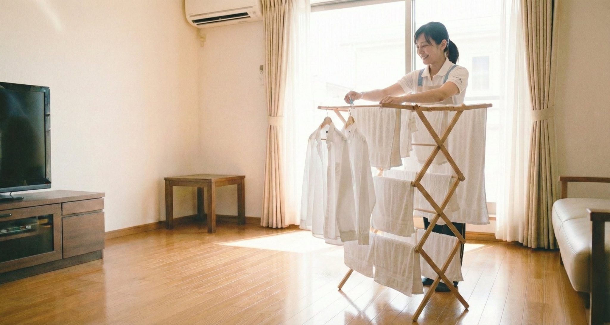 お客様の代わりに洗濯機を回し、お部屋の中に干し、乾いたら綺麗に畳んで収納場所に納めます。