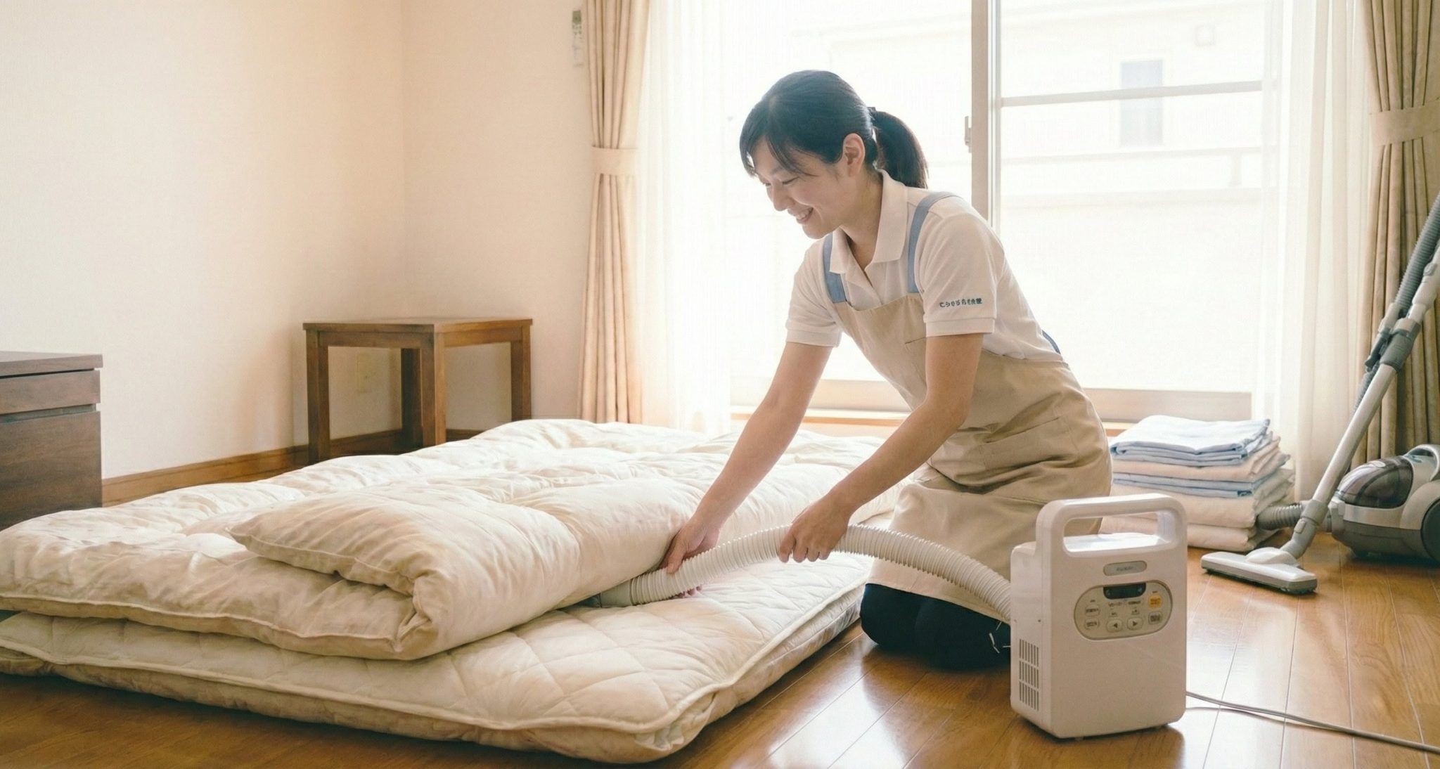 外に干せないお布団は、布団乾燥機(※お客様宅のものを使用)のセットや、掃除機での吸引をお手伝いします。シーツ交換もお任せください。