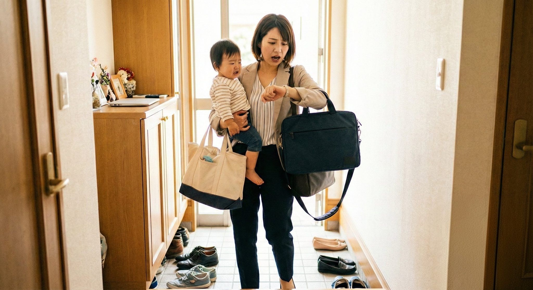 「早くしなきゃ!」泣く我が子を抱え、荷物を抱えて時計を気にする朝。