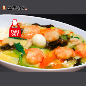 プリプリのエビとシャキシャキ野菜を特製の中華あんでとじたご飯もの。海鮮の旨味と野菜の甘みが溶け合い、最後の一口まで飽きずに楽しめます。