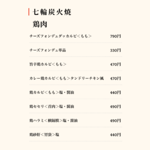 チーズフォンデュダッカルビ、旨辛鶏カルビ、鶏セセリ、鶏ハラミなど、炭火で焼き上げる鶏メニューが豊富。