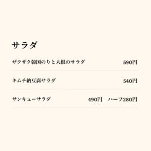 サラダや冷菜、韓国風の味付けのメニューも豊富で、食事のバランスを取りながら楽しめます。