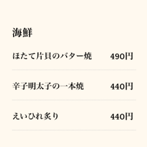 炭火で焼くホタテのバター焼きや辛子明太子の一本焼き、香ばしいえいひれ炙りなど、海鮮メニューも充実。