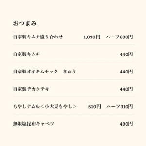 自家製キムチ盛り合わせ、もやしナムル、チャンジャ納豆の韓国海苔巻き、塩昆布キャベツなど、どれも七輪焼きとの相性が抜群。