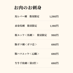 さらに、牛たんチーズつくねや厚切りベーコンといった加工肉、そして数量限定の馬刺・桜ユッケなど「お肉のお刺身」も楽しめます。