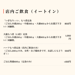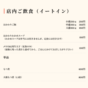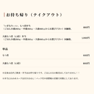 また、テイクアウトできる「もつ煮弁当」も好評で、仕事中のランチやご自宅でのおかずにもぴったりです。