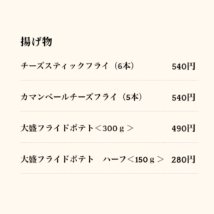 フライドポテトやチーズフライなどの揚げ物も揃い、仕事帰りの一杯にもぴったりです。