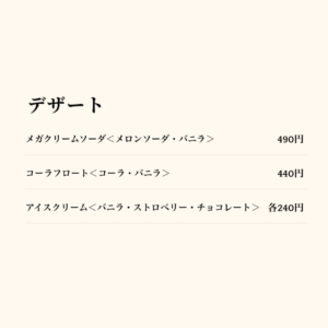 食後にはメガクリームソーダやアイスクリームなど、デザートメニューも充実しています。