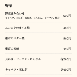 キャベツ・玉ねぎ・ピーマン・椎茸などの焼き野菜は、炭火の香りをまといながらヘルシーに楽しめます。