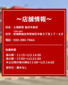 ぜひこの機会に上海厨房 仙台中倉店さまへお越しください。