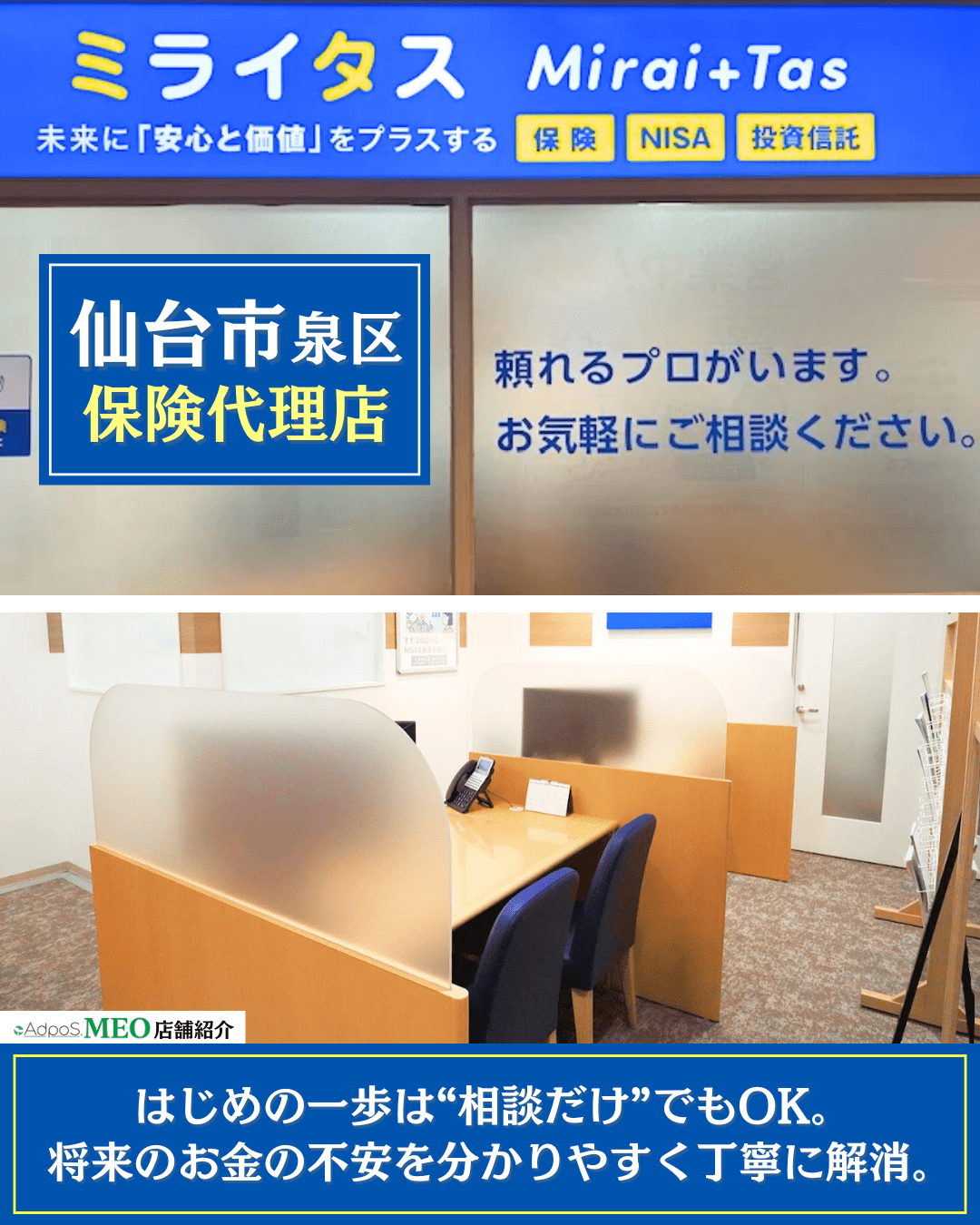 【仙台市泉区】初心者でも安心の資産形成・保険相談なら|ミライタス 泉中央セルバ店 さま