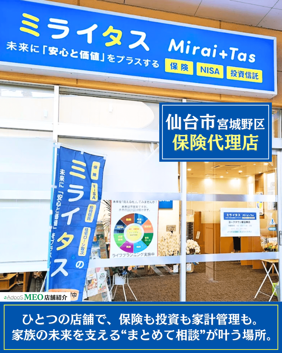 【仙台市宮城野区】保険も資産づくりも 将来のお金をトータルサポート|ミライタス ヨークタウン新田東店 さま