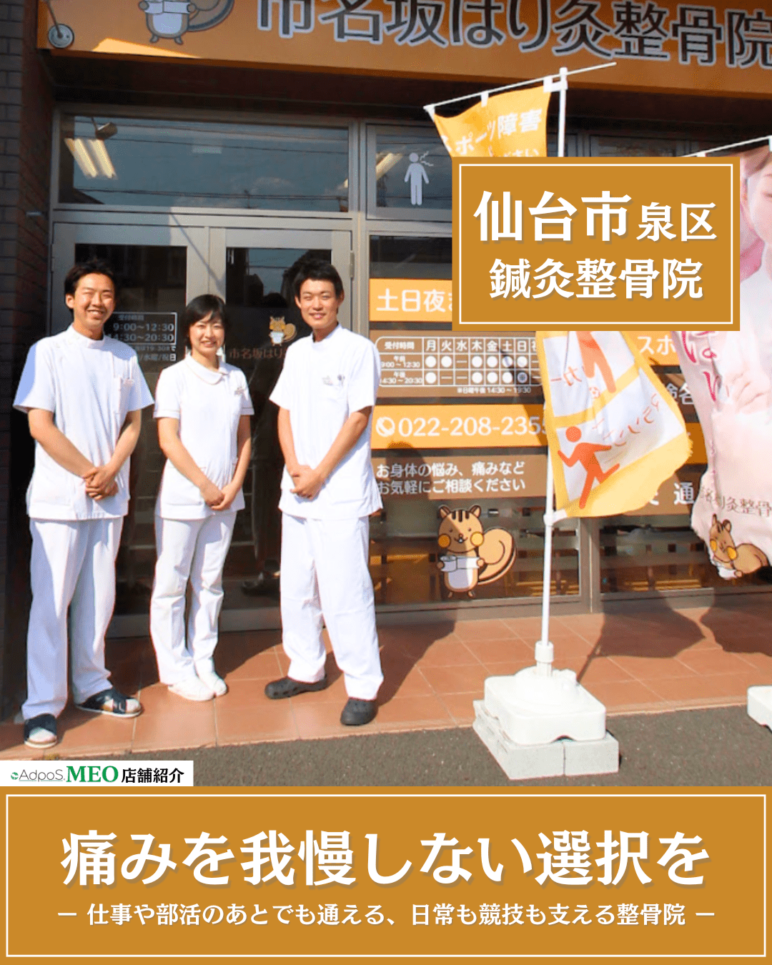 仙台市泉区市名坂エリアで、日常生活の不調からスポーツによるケガまで幅広く対応している整骨院、市名坂はり灸整骨院さまをご紹介します。
