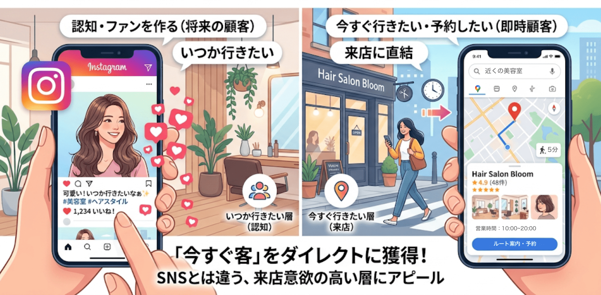 InstagramなどのSNSは、主に「いいデザインだな」「いつか行きたいな」という認知を広げるのに向いています。 一方、Googleマップで「〇〇駅 美容室」「近くのネイルサロン」と検索するユーザーは、「今日、あるいは近日中にサロンへ行くこと」をすでに決めている非常に意欲の高いお客様です。この層にダイレクトにアピールできるのがMEO最大の強みです。