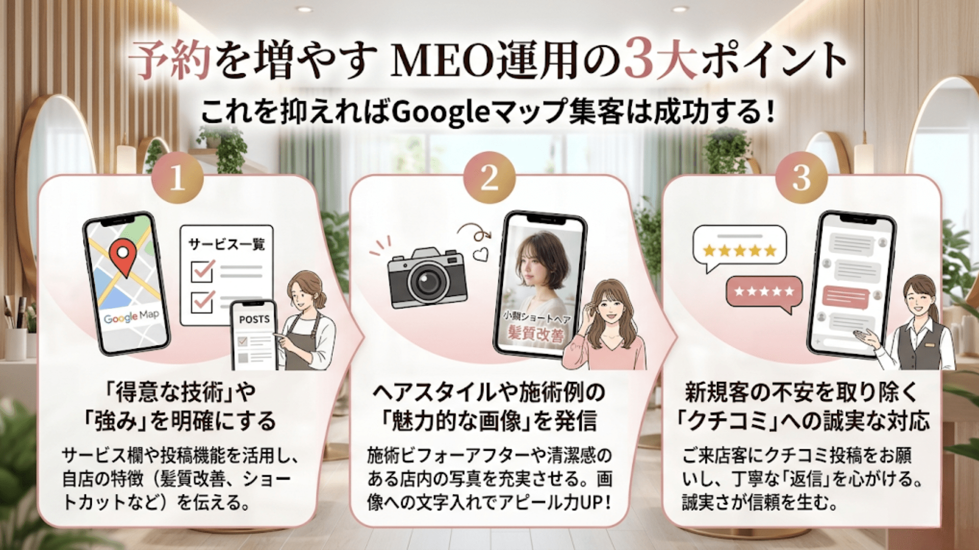 では、実際にGoogleマップから予約を増やすためには、どのような運用が必要なのでしょうか。重要な3つのポイントをご紹介します。
