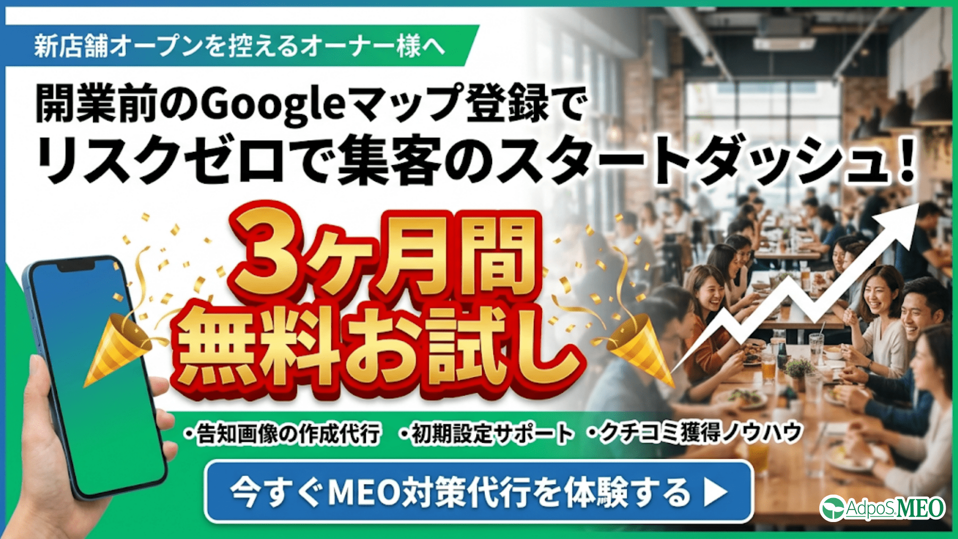 そんなお考えをお持ちのオーナー様は、ぜひ一度AdposMEOの「MEO対策代行 3ヶ月間無料お試し」をご利用ください!初期費用・月額費用が一切かからないこの3ヶ月間を利用して、開業前の認知拡大から、オープン直後のクチコミ獲得、そしてデザイン画像による集客効果までを、リスクゼロでご体感いただけます。