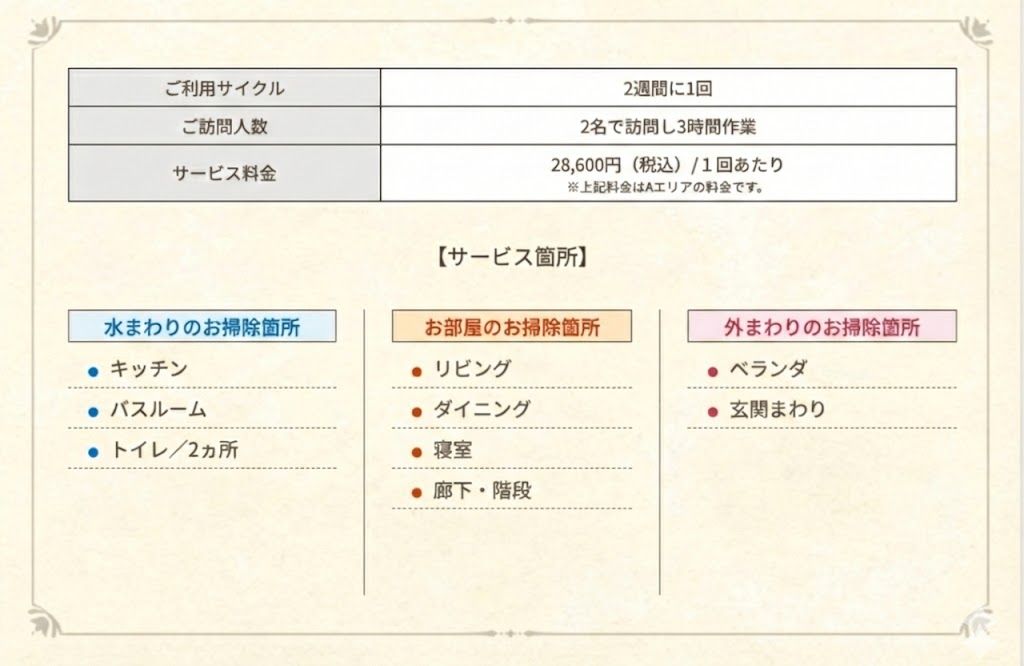 ※初回は別途料金をいただきます。(初回にご要望のすべてのお部屋の汚れを落とす念入りなお掃除をします。そのため初回のみ、通常サービス料金にプラスして別途料金をいただいています。詳しくはお見積り時にお問い合わせください。)